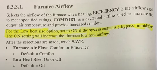 Low heat rise (option)= set ON (set to on) – that is your system has a bypass humidifier
