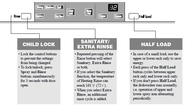Quick Tip: To lock/unlock Child Lock, press Spray and the Rinse buttons/icons for 3 seconds simultaneously(with the door open).